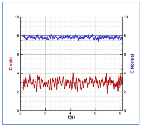 Figure 9. While the normal force coefficient (blue line) experiences small fluctuations, the fluctuations of the side force (red line) are important, ranging from the smaller values of 2 to values close to 4, with an averaged value of 2.99 within this period (T = 4 s). The fluctuations of the normal force are one order of magnitude lower. A Power Spectral Density (PSD) analysis of the forces shows energy content for frequencies below 20 Hz, with 7.3 Hz being the dominant frequency for the side force coefficient, indicating a Strouhal number of 0.150. In reference [
