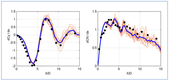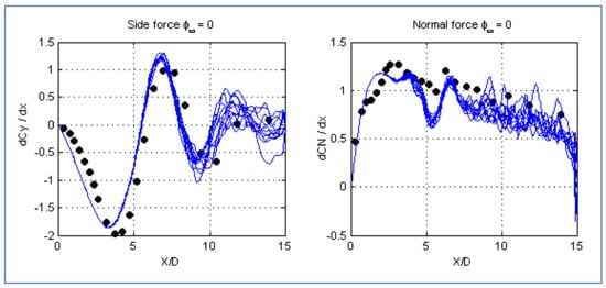 Figure 15 together with the averaged values (blue lines) and experimental data (black dots). The local curves indicate that in the region x/D < 6–7 the flow is steady, although some oscillations in the normal force coefficient appear. This is the region 3 defined by Ramberg (see [