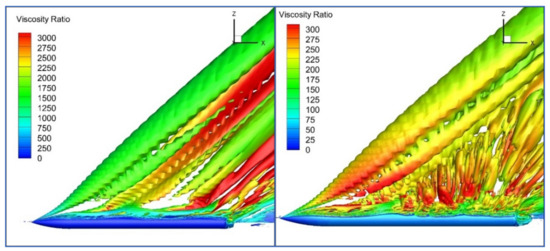 25]. It is very important to notice that the turbulent viscosity ratio in the vortex structures is one order of magnitude lower when using the RSM-SAS model, when compared to the solutions obtained with the k-ω SST-SAS model. This is a clear indication that with the latter model, RANS-like solutions are obtained, since a reduction of turbulent viscosity cannot be observed. URANS methods are overly dissipative, since all turbulent scales are modeled and only frequencies far lower than those of turbulent fluctuations are resolved [