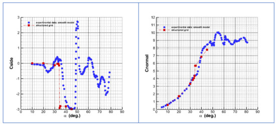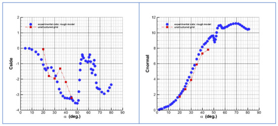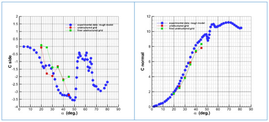 Regarding the unstructured grid solutions, the numerically obtained values of the side force coefficient and normal force coefficient are compared in