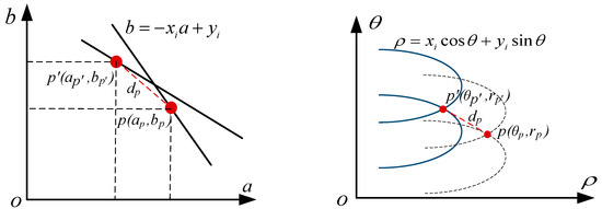 Intuitively, the difference between the two lines can be more accurately described by directly solving the “distance” between them. To solve the above problems, this paper transforms a straight line into a parametric space and defines the reprojection error of the straight line by solving the distance between the two points in the parametric space Cartesian coordinate system.
