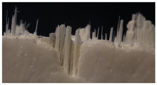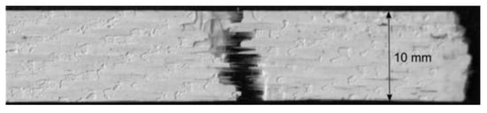 One of the most important material properties of CMC is its morphology in terms of homogeneous porosity and permeability. These characteristics are of particular importance as they are responsible for the excellent damage tolerance and shock resistance of CMCs. In contrast to monolithic ceramics, reinforcement with fibres leads to a crack growth process described by Levi et al. [] as a weak matrix concept, leading to higher material strength as the reinforcing fibres remain intact. The key to this behaviour lies in the porous matrix, which, as shown in Figure 1, leads to a deflection of the cracks along the fibre direction. In addition, the reinforcing fibres bridge the damaged matrix as the crack propagates. This results in a force acting on the crack flanks, which counteracts the widening of the crack. However, if the strength of the reinforcing fibres is exceeded, they also crack, but usually not in the plane in which the crack occurred. Accordingly, the ends of the reinforcing fibres are pulled out of the surrounding matrix, dissipating energy and consequently reducing crack growth. This mechanism, known as fibre pullout, results in a damage pattern shown in Figure 2.