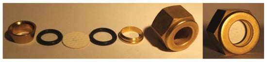 The discs were placed in a sample holder together with the seals, as shown in Figure 3. Different types of gaskets were tested for this. The assembly was then integrated into the test bench described below. The tests were carried out in the oxygen section with nitrogen gas at room temperature and an initial pressure of 15 bar. The sample holder was mounted at the end of the oxygen section and the pressure curve was measured. In order to check the test setup and to obtain a reference value, a comparative test was carried out with a gas-tight sample disc made of copper.