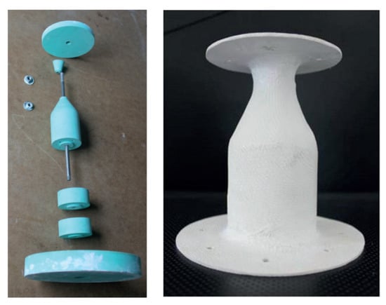 (left) Segmented structure of the production mould and (right) first manufactured prototype with a total mass of around 300 g.