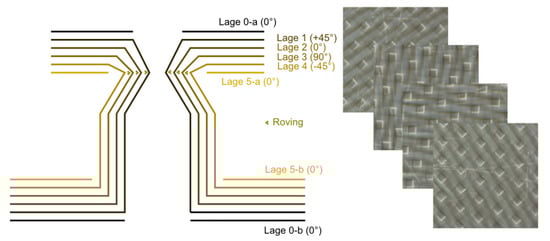 Layer structure of the laminate for prototype production with fabric images to illustrate the fibre directions.
