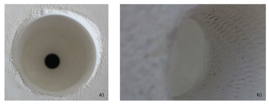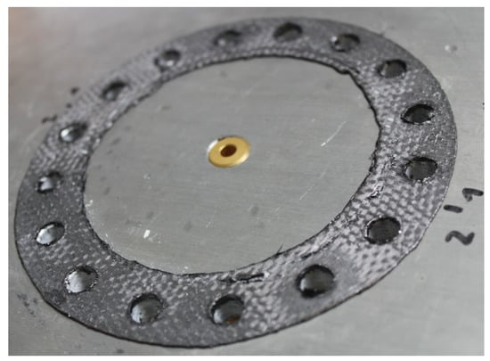 In order to evaluate the performance and suitability of the coating, a series of leak tests was carried out in accordance with DIN EN 1779-D1 []. The concept of these tests was to measure the pressure drop across the coated and uncoated samples and thereby make a qualitative statement about the influence of the coating. The design of the samples and their integration is shown in Figure 3. Discs with a diameter of 18 mm were milled out of a plate with four fabric layers and then round ground to a final diameter of 17 mm. Since there is a smoother and a rougher mould surface, the specimens were tested in both directions. In addition, samples with three, six and eight fabric layers were made to investigate the effect of sample thickness on permeability. However, all coated samples had a number of layers of four.