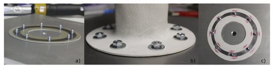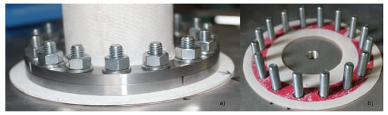 In order for the graphite to compensate for the unevenness of the ceramic surface, it must be pressed sufficiently. A special indicator foil from Fuji was used to determine the contact pressure. This is placed parallel to the seal used between the components to be joined and changes colour to a greater or lesser extent depending on the contact pressure. The foil used here can indicate pressures between 10 and 50 MPa by changing colour from white to light to dark red []. In addition to the contact pressure, the discolouration also depends on the ambient temperature and humidity. By comparison with a comparative scale, the pressure of the surface pressure can be determined locally. Figure 9 shows that initial tests in which the flange connection was realised using eight M6 bolts with associated washers produced unsatisfactory results. Although the surface pressure in the area of the screw heads and washers can be considered sufficient, the contact pressure could not be maintained between these areas because the stiffness of the 2 mm thick ceramic is not high enough.