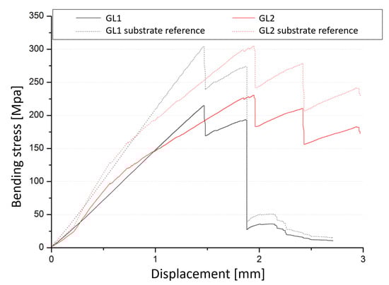 Since the glaze is an unprotected test product and is only available to a very limited extent, unfortunately only two coated test samples could be created. Statistically reliable results could not be obtained from this. However, initial statements can already be made on the basis of the measurement curves recorded in Figure 13. In sample GL1, the glaze was aligned upwards, in sample GL2 it pointed downwards. In the stress increase of the latter, a non-linear and thus elastic area is shown. The reason for this behaviour is that the sample is not straight, but bended. This bending re-sults from the fact that the coating was applied only on one side, which results in an asym-metrical force that the sample cannot withstand and thus leads to its bend. However, the resulting bend is evidence for a sufficient adhesion between the coating and the substrate. If the adhesion would be insufficient, the force could not be transferred to the sample and no bending would occur. The distortion could be avoided by applying the coating on both sides. Although the final stress drop in sample GL1 occurs earlier, it is not possible to conclude that the results are directional due to the small number of samples.