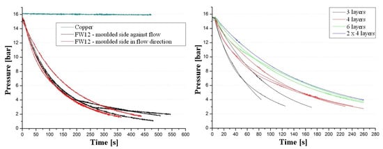 Pressure curves determined in leak tests, (left) in relation to the reference sample made of copper and (right) in comparison of different layer structures.