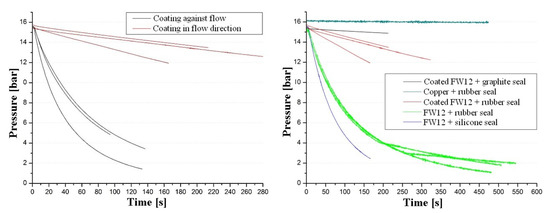 Pressure curves determined in leak tests, (left) in relation to the installation direction of the coated specimens and (right) comparing different types of gaskets.