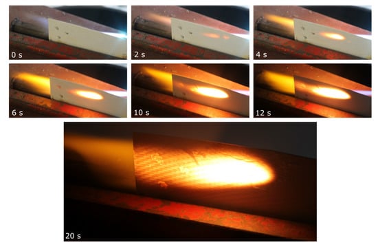 In order to be able to investigate the high-temperature behaviour of the OCMC FW12 and its coating in advance, experiments were carried out with an oxy-acetylene torch, the flame of which was directed at different distances and angles onto coated and uncoated material samples. The exposure was maintained until failure of the sample, but for a maximum of 20 s. The flame temperature is around 3200 °C in the core, while temperatures between 1200 and 2500 °C occur in the scattered flame. Since most available thermocouples can only be used at temperatures of up to 2000 °C and thermocouples for higher temperature ranges are cost-intensive and prone to oxidation, it was not possible to measure the sample temperature directly. Without contact, the temperature could have been determined with a pyrometer if the emissivity was known. However, such a device was not available for the test, so that only qualitative conclusions can be drawn from the investigations [].
