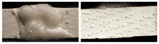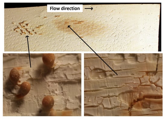 The basic behaviour is shown in Figure 17. After 20 s, local melting occurred on the surface of the longitudinally flowed material sample, which can be seen in Figure 18. The melting mainly affects fibre bundles lying on the surface that were exposed to the direct incident flow. Downstream, there was also a brownish discolouration of the surface. On closer inspection, this area shows small cracks resulting from thermomechanical stresses. In principle, local melting also leads to a loss of damage tolerance.