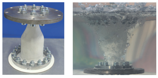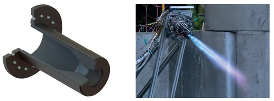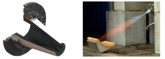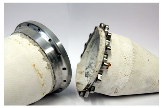 Moreover, Ortelt et al. [] took advantage of the OCMC’s porosity and permeability to design a cone injector, which consists of an alternating concentric ring-gap system with a cone body inlay made of a robust OCMC, namely FW12. It is based on aluminum oxide fibers and a matrix. “Foundation for this material are a bimodal grain size distribution of the used ceramic powder, an optimal ration of alumina and zirconia powder, the weak-matrix concept of fiber-reinforced ceramics and a rheological adapted suspension to the processing technology” []. So far, this injector has only been tested in cold-flow tests.