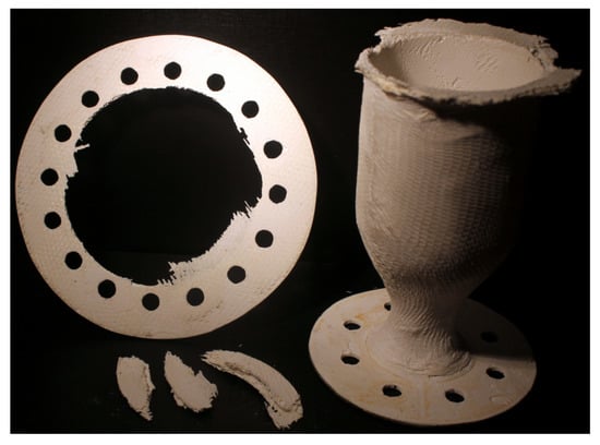 In addition to the flame tube, a second prototype was developed, which, as can be seen in Figure 6, combined a conical nozzle in one component in addition to the cylindrical combustion chamber part. In addition, there are flanges at the combustion chamber and at the nozzle outlet to enable assembly and sealing of the volume. For this purpose, a mould was first made from SikaBlock® M940 [] onto which the final component can be laminated. The moulded body shown in Figure 6 has a segmented structure to enable the production of firing chambers of different lengths and non-destructive demoulding. Due to the complex contour, a simple winding of the fabric was not possible. Instead, individual layers had to be applied to the mould. The fabric layers were prepared to slightly overlap the combustion chamber. To map the nozzle neck and the flanges, it was necessary to cut into the fabric. As a result of the additional overlaps created by this, the nozzle neck has a greater wall thickness. Since increased loads are to be expected in this area, the thickening is considered an advantage. In order to achieve high strength, a structure consisting of four layers at angles +45°/0°/90°/−45° was chosen, as shown in Figure 7. The 45° layers can be warped very well and are therefore easier to place on the mould. An additional fabric layer was applied to both sides of the flanges to achieve the straightest and cleanest possible finish. In addition, the six-layer structure provides reinforcement for later assembly.