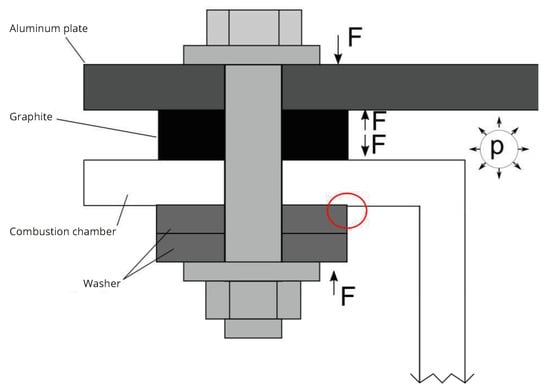Such unevenness must be compensated for by a suitable seal. Expanded graphite was chosen as the sealing material for sufficient adaptation. The material used was SF TRD 401 from the company thoenes® [], which withstands operating temperatures of up to 2500 °C. Since this is pure carbon, the seal must be protected from oxidation. Accordingly, the operating temperatures only apply in the absence of oxygen. Direct contact with liquid oxygen should be excluded due to the high risk of fire. As shown in Figure 9, the graphite was therefore protected by an intermediate layer of mica both on the side facing the combustion chamber and on the side facing the environment. This high-temperature flat gasket material, called Hi-Temp 710, consists of at least 90% phlogopite and maximum 10% silicon and has a maximum application temperature of 1100 °C [].