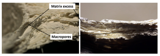 The destruction of the prototype had another advantage in addition to the knowledge gained about the application of the material. Since, as can be seen in Figure 23, smaller parts were torn off in the area of the bend between the cylindrical combustion chamber and the flange, the cross-section of the bend could be analysed in order to draw conclusions about the quality of the manufacturing. Although the crack leading to failure occurred due to the shear effect at the level of the inner edge of the shim rings, weak points in the form of low fibre volume fractions can also be identified in the bend. As can be seen in Figure 25, macropores form between the individual layers during production due to the already discussed poor pressing of the fabric layers into the mould edge. Due to shrinkage processes during drying and incomplete infiltration, only partial matrix accumulation occurs in these macropores. It can therefore be seen that the production of more complex contours and their integration into engine assemblies represent major challenges in the application of OCMCs.