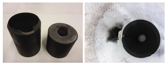 Analogous to the ceramic chamber concept, a comparative engine with a steel casing was developed in parallel. This can be seen in a sectional view and in operation in Figure 26. Figure 27 shows the engine with the casing made of OCMC for comparison. With the steel combustion chamber, 23 test runs were successfully carried out. However, cracks appeared in the graphite inlay, which can be seen in the Figure 28 on the left. Yet the inlay was not destroyed. In fact, it remained intact to the extent that no significant drop in performance could be detected. It can be assumed that these cracks were caused by shocks, as the graphite is a very brittle material and thus susceptible to water hammer. These can be avoided by adjusting the start-up procedure of the engine. Alternatively, fibre-reinforced graphite could be used to withstand the stresses.