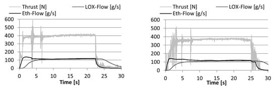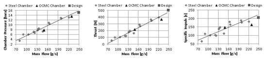 The application of the OCMC, on the other hand, is to be judged positively and shows comparable test results to the steel engine. Figure 29 compares the measured values obtained in representative tests graphically. An explicit representation including additionally calculated performance characteristics can be found in Table 4 and shows similar values for both engine types. The graphical representation of the combustion chamber pressure, the thrust and the specific impulse as a function of the fuel mass flow in Figure 30 underpins this. It can be concluded that the OCMC does not have any negative effects in this application, but only the advantage of weight saving. Nevertheless, given the limited number of tests conducted so far, this result for the applicability and suitability of the combustion chamber design is still preliminary and further tests are required to scrutinise the results.