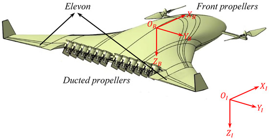 We designed a novel tilt-propulsion UAV with BWB configuration (shown in Figure 1), consisting of fuselage, front propellers, ducted propellers, and elevon. The front propellers, composed of a pair of propellers, are symmetrical at the X axis of the fuselage, which cannot tilt, so that they just provide a vertical thrust for UAV. The ducted propellers were installed at the rear of the fuselage, dividing the left and right groups, and the ducted propellers have the ability to change thrust direction by tilting, with a range from π⁄2 to 0.