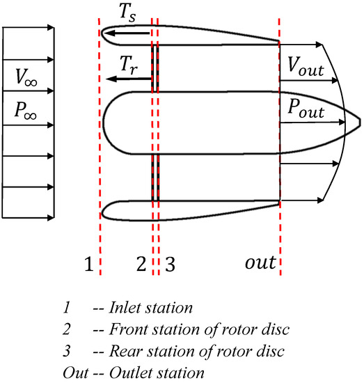 The total thrust of the duct system is composed of the thrust of external duct and the rotor thrust. Based on the momentum equation in integral form [30], from the upstream constant pressure zone to the downstream outlet station, the total thrust is expressed as