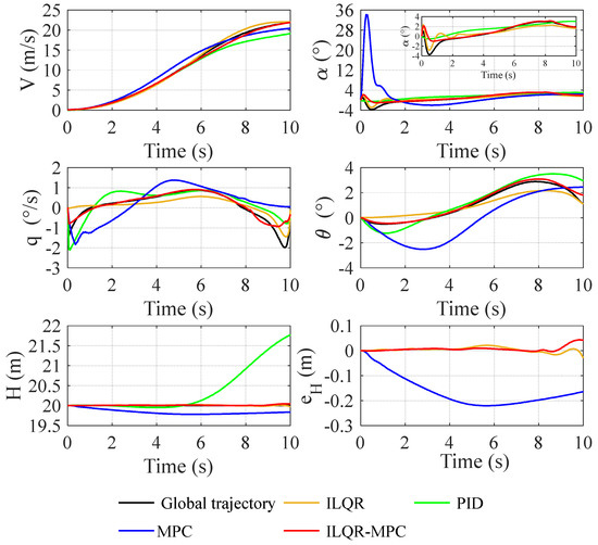 Then, the simulations of transition flight were performed for comparison between the ILQR-MPC with an ILQR feedforward controller, the PID controller and the MPC controller.