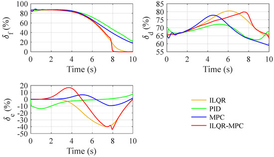The manipulation difference between ILQR-MPC and PID controllers is mainly shown in the second half of the transition flight (5 s~10 s). The throttle of the ducted propellers of the ILQR-MPC controller is significantly higher than that of the PID controller, while the throttle of the front propeller of the ILQR-MPC controller is lower. In addition, the is smaller, meaning that the upward deflection angle of elevon is larger based on the ILQR-MPC controller (the downward deflection is positive). When the tilt angle of the ducted propellers is large, the UAV overcomes the drag by lowering its head, while the UAV relies on the thrust horizontal component of the ducted propellers to obtain a stronger acceleration ability when the tilt angle is small. The of the ILQR-MPC controller is larger, so it achieves better speed-tracking in transition flight. After 8s, of the ILQR-MPC controller reduces to zero; that is, the front propellers stop, which is a reasonable operation for the following two reasons: on the one hand, a smaller leads to more energy being saved, and on the other hand, as the flight mode gradually changes to a fixed-wing mode, the front-propeller propellers are no longer required to provide lift. In second half of the transition flight, the airspeed is big enough, and the attitude control has a better efficiency based on aerodynamic surfaces than the thrust differential produced by the front propellers and the ducted propellers, so the elevation deflection angle of the ILQR-MPC controller is larger.