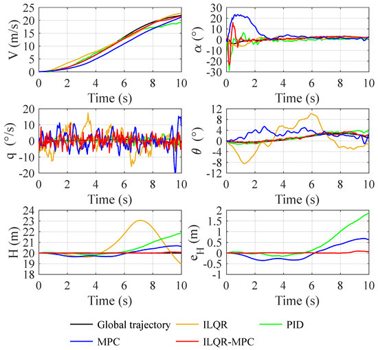 Based on feedback correction, MPC and ILQR-MPC have the advantage of disturbance rejection. Therefore, the altitude tracking error of the ILQR-MPC controller is very small during the whole transition flight, with the smooth change in airspeed and pitch angle. ILQR-MPC linearizes the dynamics along the state trajectory, which has two advantages. On the one hand, the ILQR-MPC has linear complexity to improve the computation efficiency and greatly reduces the difficulty in solving nonlinear problems. On the other hand, the method with dynamics linearization at discrete points has a higher control precision than MPC [21]. To suppress the disturbance caused by high-frequency Gaussian white noise, the input variation in MPC and ILQR-MPC controllers is no longer smooth. However, based on the receding horizontal optimization, MPC and ILQR-MPC controllers can make full use of the dynamics used to predict states in the future time domain; therefore, the chattering of inputs is much smaller than that of the PID controller. Overall, compared with the ILQR feedforward controller, PID controller and MPC controller, ILQR-MPC can deal with uncertainties more effectively, with stable inputs and state tracking.