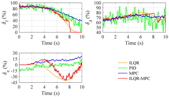 The ILQR feedforward controller cannot suppress the significant uncertainty leading to the rapid deterioration in the control effects, which leads to serious altitude errors, and even the risk of crash. Although the control effect of the PID controller is only slightly reduced, the inputs are greatly shaken, bringing a great burden to actuators.