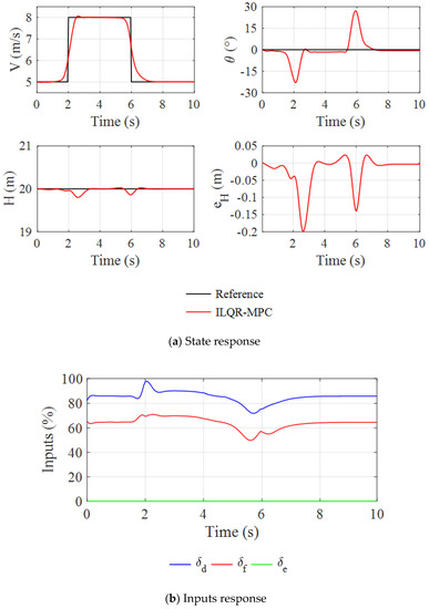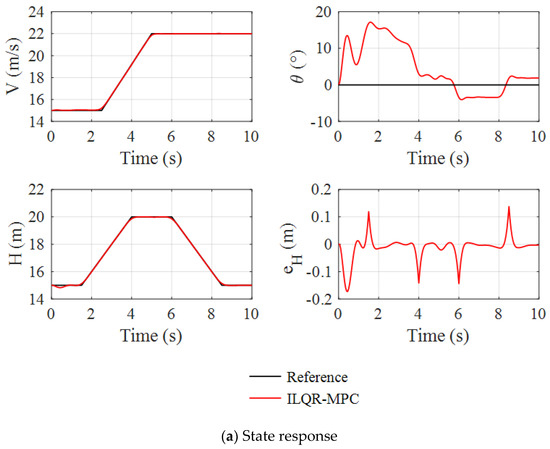 The results in Figure 11 show that the ILQR-MPC controller has a fast and accurate tracking response with a smooth change of states. TPUAV lowers its head quickly to improve velocity near the time of , and raises its head sharply near the time of to realize rapid deceleration by the horizontal component of thrust and aerodynamic resistance. Under this velocity step commander, the altitude tracking error is kept within , which reflects the applicability of the ILQR-MPC controller in the rotor mode.