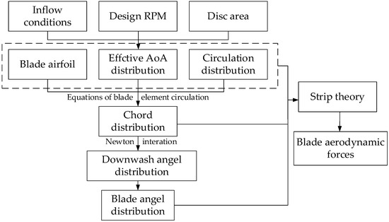 The Betz theory of optimal circulation is the initial blade design methodology at a specific condition, though it omits the blade element drag. Then a numerical method based on strip theory is applied to the blade performance analysis. Figure 3 presents the flow chart of the blade design process.