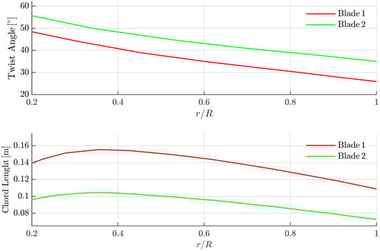Respectively, two blade distributions of chord length and twist angle are calculated, which are presented in Figure 5. Blade 1 is generated from the element distribution of the maximum lift-to-drag ratio, while the Blade 2 element distribution is correspondingly generated from the top lift coefficient. Their performance comparison in the hovering condition is presented in Table 1. From the table, it can be perceived that the power loading and hovering efficiency of Blade 1 are both better than Blade 2. Therefore, Blade 1 is selected as the initial design for the subsequent optimization.