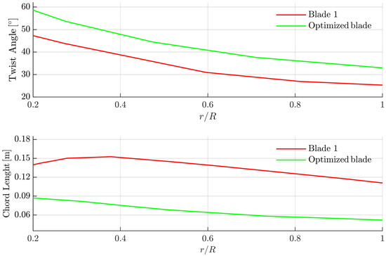 All combinations of effective AOA distribution are evaluated via the numerical method based on strip theory. The blade geometric parameters comparison before and after optimization is shown in Figure 7. The optimized blade chord length decreases, and the twist angle of blade elements increases, which reduces the disc solidity significantly. The chord length from root to tip is gentler, similar to the traditional high-speed rectangular blade.