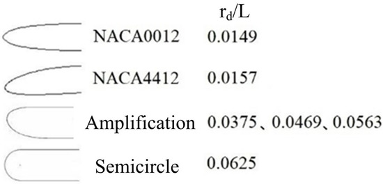 The fan disc represented by the virtual disc with momentum sources is set at 0.08 L backward from the foremost lip point. The lip shapes are described in the order of lip radius increasing. The R/L value is used to characterize the geometric characteristics of these shapes. NACA0012 and NACA4412 airfoils are selected in the former two profiles. The third one adopts the lip shape with R/L from 0.0375 to 0.0563, which has a 1/1.25/1.5 proportional amplification of the rd/L value. The fourth one is a semicircle lip.