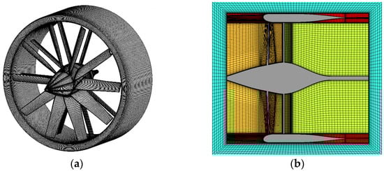Fan disc mesh model at 0.08 L axial position. (a) The surface mesh on the duct wall, fan blade, and stator blade. (b) The structure of multi-layer sliding mesh along the axial direction.