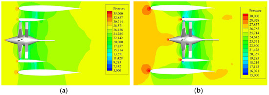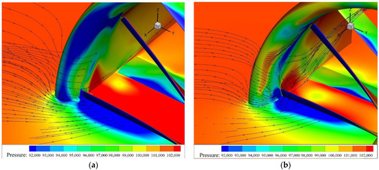 From the extracted static pressure distribution of the flow field in Figure 12a, little backflow appears near the blade tip at the axial position of 0.08 L, which slightly influences the turbulence near the lip. On the contrary, in Figure 12b, the turbulence streamlines near the duct lip are further disturbed due to the weak axial flow induced at the rear axial position of 0.2 L. The blade tip vortex is not effectively controlled, resulting in a forward development to the duct lip, forming a so-called block effect. Consequently, a significant loss of thrust happens due to generating a stable circulation near the duct lip.