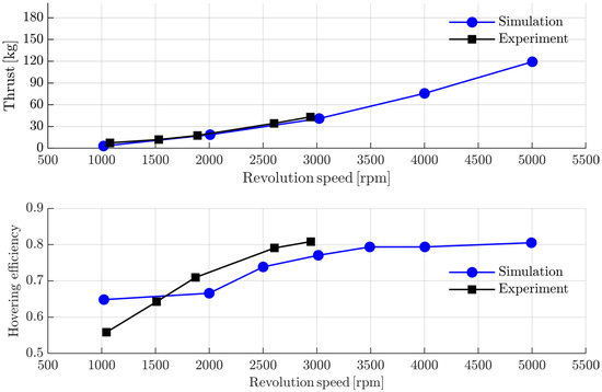 The experimental results are shown in Figure 14. The relative thrust error between the experiment and simulation is under 8%, and that of hover efficiency is under 10%. This marginal difference and the trend consistency under 3000 RPM both support the ducted fan optimization results justice. The thrust experiment is slightly larger than the design at the same power consumption, which presents a higher hovering efficiency. Finally, the optimized ducted fan reaches a 76.3% hover efficiency in the full-scale experiment, which proves the feasibility of the optimization and the accuracy of performance evaluation.