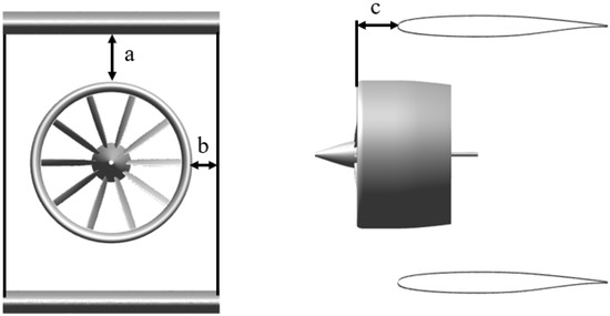 In a DFW unit, three geometric parameters can fully determine the relative position of the wings and the ducted fan. The three parameters, a, b, and c, are shown in Figure 15. The aerodynamic optimization of the DFW unit is based on the sensitivity analysis of these parameters.