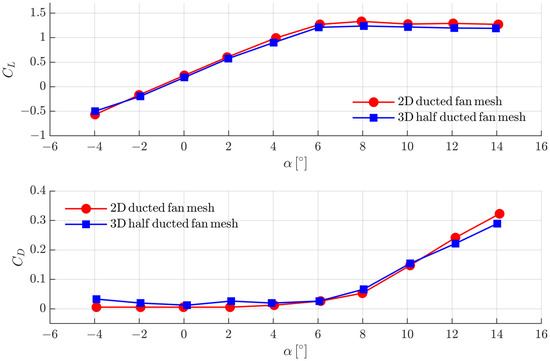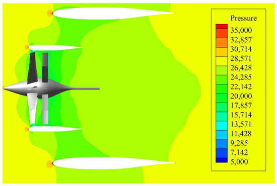 An optimized distributed ducted fan system, which eliminated the power gap in aircraft design, was proposed by Guo and Zhou. They adjusted the contraction and expansion of the wake to ensure high efficiency in different flight modes [16]. Complex flow phenomena including internal and external flow can be generated when a ducted fan or propeller is located between the wings. The flow near the wings is accelerated by the slipstream, which results in different lift-and-drag contributions of the upper and lower wing surfaces. The suction effect of the discs causes the flow in front of the wings to turn and accelerate, which results in a decrease in the local angle of attack (AoA) of the wings. Other effects on cruising efficiency, stall characteristics, and control capability would also be influenced by this tight aerodynamics coupling, and it should be addressed in the conceptual design stage.