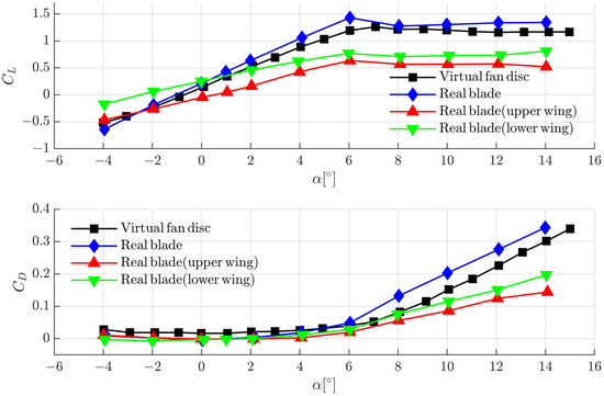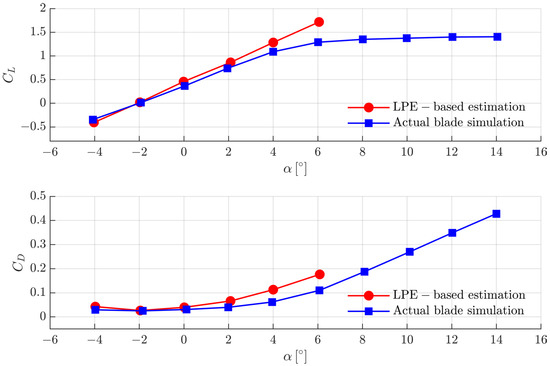 The total lift-and-drag coefficients from the LPE-based estimation and the CFD simulation involving the actual blade model. (Upper) Lift coefficient comparison; (Lower) Drag coefficient comparison.