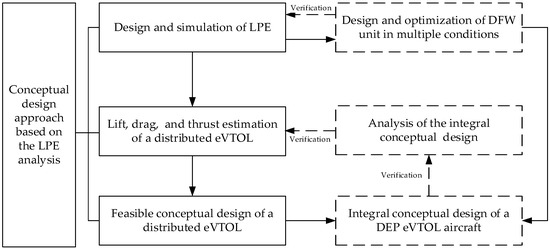 From the perspective of function, LPE represents the basic performance of aerodynamics and propulsion of a DEP eVTOL design. The lift, drag, and thrust characteristics of LPE demonstrate the eVTOL performance in multiple flight modes, especially the hover efficiency in VTOL mode and cruising efficiency in cruise mode. Its performance data are the basis for the analysis of the conceptual design. Furthermore, engineers can analogically adopt LPE in the DEP eVTOL conceptual design workflow to the airfoil aerodynamics analysis in the conventional fixed-wing aircraft design. In light of this, after the DFW unit performance optimization, an efficient DEP eVTOL conceptual design approach based on the characteristics of LPE can finally be established.