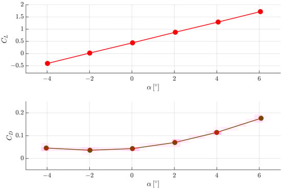 From the investigations of several airfoils used in blade design research, the ARA-D shows a high lift-to-drag ratio in the AoA range of blade elements, which is favorable to the blades’ propulsion potential. Moreover, it has a large maximum lift coefficient and smooth decline of aerodynamic performance after stall, which is also preferred in the blade design with an extensive range of and collective pitch angle. Consequently, we choose the ARA-D airfoil as the blade element [17,18,19].