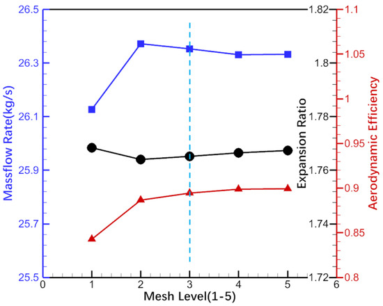 To achieve mesh-independent numerical solutions, five different levels of mesh configuration (140 k, 440 k, 1000 k, 3000 k, and 10,000 k)were conducted on a single passage model based on steady-state simulations. The computational domain of the turbine extended one axial chord upstream of the vane and two axial chords downstream of the rotor. A mixing plane was used to transfer data between the rotating and non-rotating blocks. Total pressure (510,000 Pa) and total temperature (1480 K) were defined as the boundary conditions at the vane inlet. The static pressure at the hub of the rotor exit was specified as 237,000 Pa with radial pressure equilibrium. By comparing the mass flow rate (blue line), expansion ratio (black line), and aerodynamic efficiency (red line) for different mesh levels (shown in Figure 1), it was found that the aerodynamic performance of the turbine significantly changed from level 1 to level 3 while, from level 3 to level 5, it essentially remained constant. As a result, in comprehensive consideration of both the accuracy and the computational cost, level 3 was chosen as the computing mesh for the following numerical simulations. There were 1.08 million grid points in a single passage (Figure 2a) and nearly 32 million in the full annulus (Figure 2b). The thickness of the first near-wall cell was 0.001 mm and was about 1. A single-stage turbine with an equally spaced vane assembly is used as the baseline configuration, identified as Case0_Baseline.