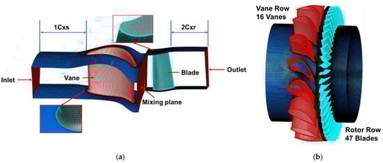 The in-house CFD code HGAE was used to simulate the unsteady flow field of the turbine stage. HGAE is a three-dimensional, unsteady, time-accurate, Reynolds-Averaged Navier–Stokes (RANS) solver, adapted for turbomachinery applications in aerodynamic and aeroelastic cases and was validated in various typical cases [35,36,37]. More details can be found in Zheng [38,39].