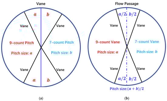 It should be noted that the segmentation method of the asymmetric vane configuration in this paper is based on a pitch count, generating two sizes of pitch ( and ), as shown in Figure 5a. However, the segmentation method in some studies [26,30] was based on a vane count, with a dividing line between two segments as the flow passage, which results in three sizes of pitch (, and )) being generated (Figure 5b). This does not accurately conform to the intended design with only two sizes of pitch and the effect of the segmentation method on the flow mechanistic analysis induced by asymmetric vane pitch is demonstrated later.