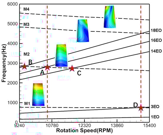 A common way to identify the resonance risk of rotor blades is through the use of a Campbell diagram. Such a diagram shows the natural frequencies of the rotor blade as a function of its rotational speed, while the excitation frequency lines are plotted with a constant slope against the rotational speed for various numbers of excitations per revolution (i.e., excitation order; EO). Resonance occurs at the crossings between the natural frequency lines and the excitation frequency lines. Although Campbell diagrams are useful in identifying the operating conditions where the resonance occurs, they do not provide information on the vibration intensity at the resonance point. Furthermore, it is difficult to avoid all crossings on the Campbell diagram in engineering practice; therefore, it is important to study and accurately predict the response amplitudes of the rotor blades at the resonance point. The Campbell diagram for the turbine stage is shown in Figure 6. The natural frequencies and mode shapes of rotor blades were obtained by finite element analysis (FEA). The natural frequency and the excitation frequency are represented by the black dashed and solid lines, respectively. The crossings of interest that are thoroughly studied in this paper are highlighted by red pentagrams, carried out progressively as the content advances. For the baseline configuration, 16 vane wakes and the potential field lead to 16EO excitation on the rotor blade, which excited the 16ND response of the rotor blade. Therefore, the 16EO excitation line is shown in the Campbell diagram in Figure 6. The 16EO excitation line crosses the second-order modal (M2) of the rotor blade at point A, which is the resonance point of the VPF in Case0_Baseline. The other crossings on the Campbell diagram are the operating conditions for later analysis of the effect of different vane configurations on the resonance response of rotor blades at other resonance points.