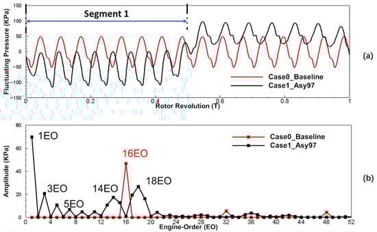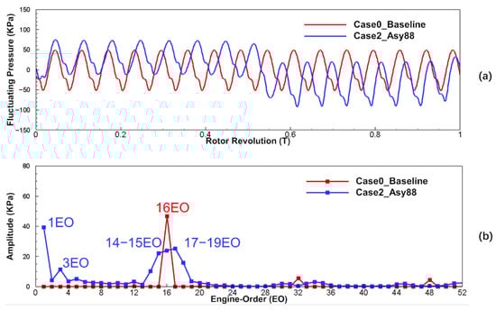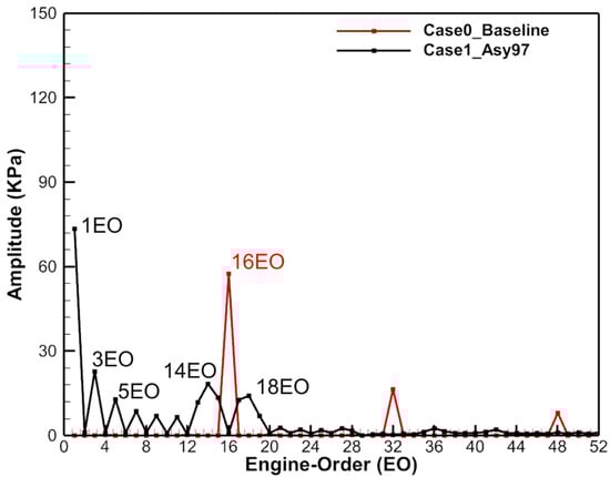 The 16EO and its multiplicative frequencies in Case0_Baseline (red line) are shown in Figure 8, among which 16EO is the principal harmonic, corresponding to VPF from the vane count. Compared to Case0_Baseline, the amplitude of VPF in Case1_Asy97 (black line) was reduced by more than 98%, as the energy was shifted into neighboring frequencies ((e.g., 14EO, 18EO). However, even at these new frequency components, the excitation amplitudes from the vane wake and potential field were reduced, compared to Case0_Baseline. Therefore, the half-and-half layout is effective in reducing the amplitude of VPF by shifting energy from the VPF of the uniformly spaced vane configuration to neighboring frequencies, as well as reducing the amplitudes at each frequency component. This is the reason why this asymmetric vane configuration was widely recognized in a large number of studies [24,25,26,27].