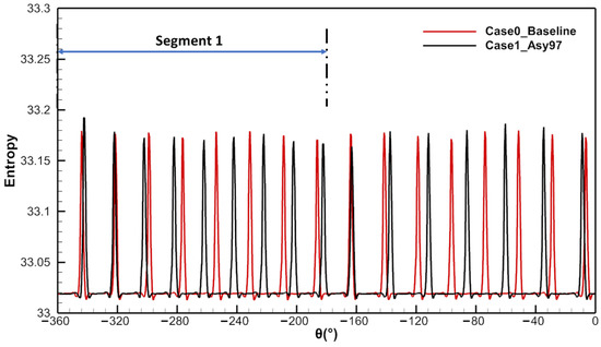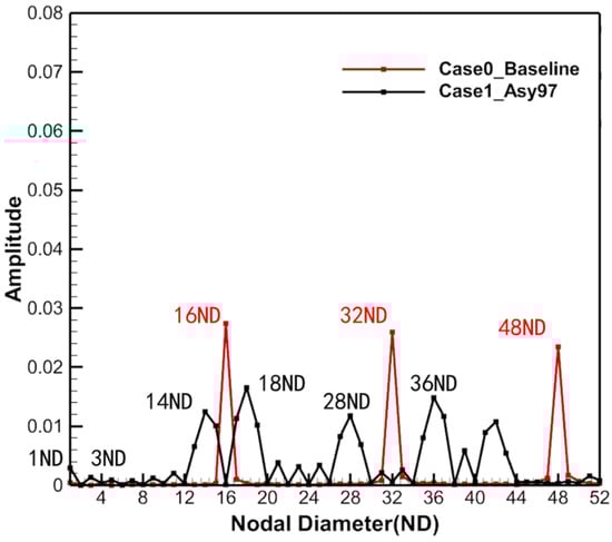The nodal diameter (ND) component again indicates that the 16ND component of vane wakes in Case1_Asy97 (black line) was deconstructed and the energy was shifted to 14ND and 18ND with different entropy peaks. The 16ND component of vane wakes still had some spectral energy but its amplitude was reduced to an almost negligible value. This result presents similarities to the high-engine-order frequency component of the fluctuating pressure on the rotor blade described in Figure 9. Thus, the vane wake is one of the sources of the high-engine-order excitation of the rotor blade. An important finding is that, in the entropy spatial spectra of Case1_Asy97, in addition to high-order NDs, there were no lower-order NDs with high amplitude (where low-order ND refers to the region where the ND is less than 10). Among them, the amplitudes of 1ND–5ND were only 10.9–3.2% of that of 16ND in Case0_Baseline. In other words, in Case1_Asy97, the strength of the low-order NDs contained in the vane wake is far below the strength of the LEO excitation observed on rotor blades. These results suggest that the contribution of the vane wake is mainly to high-engine-order excitations, contributing little to the LEO excitation of the rotor blades.