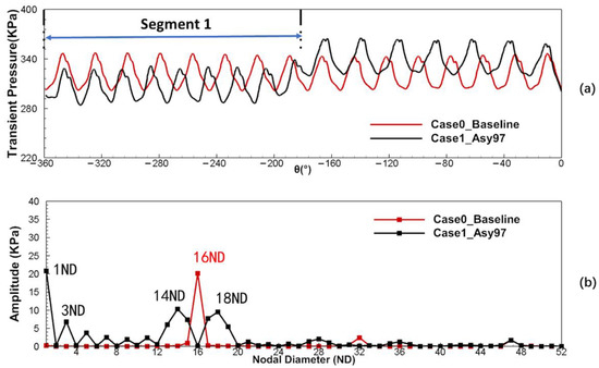 As the vane wake in the asymmetric configuration contributes less to the LEO excitation on rotor blades, it is more important to pay attention to the influence of the potential field, which is another excitation source in the current flow field. The potential field corresponds to the pressure disturbance in the flow field and the transient pressure was directly used to characterize the potential disturbance in some literature [48]. To clarify the disturbance mechanism of the potential field, the transient pressure profile at the vane exit (red line in Figure 10) was extracted. The circumferential distribution (Figure 13a) and spatial spectra (Figure 13b) of the transient pressure of Case0_Baseline and Case1_Asy97 running at the resonance point D are shown.
