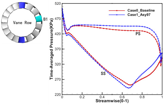 To further investigate the factors influencing the potential field in different segments, the time-averaged pressure distribution of the vane surface was calculated (Figure 14), as the area enclosed by the pressure curve represents the aerodynamic loading of the vane, which is closely related to the strength of potential fields of the vane row [49]. According to Case0_Baseline (red line), the peak velocity occurs at 67% of the axial chord from the leading edge on the suction surface (SS), followed by an adverse pressure gradient region that relaxes as it approached the trailing edge. The vane presents an aft-loaded pressure distribution, such that the downstream rotor blades are more affected by the potential field of the upstream vane row, due to high loading and flow speed in the rear part of the vane. In Case1_Asy97 (blue line), the loading of B1 (cyan blade in Figure 14) increased significantly and the downstream rotor blade was more strongly affected by the potential field of the upstream vane row when passing through the upstream potential field. It is clear that the variation of the vane pitch has a significant impact on the strength of the potential field of the vane row.
