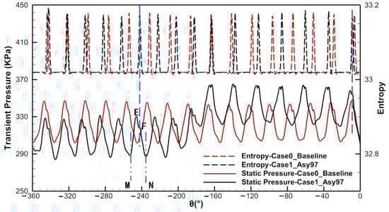 Furthermore, the circumferential distribution of the transient pressure at the vane exit (Figure 13a) is not as described by most of the literature [50,51], where the pressure disturbance of the potential field exhibits a relatively perfect sinusoidal waveform, and there are multiple pressure peaks (or pressure bumps) in each minimal positive period, such that the potential field of the vane row may not be the only excitation source for LEO, although it is the main excitation source (as was demonstrated). To better reveal the flow physics of multiple pressure peaks, the circumferential distributions of transient pressure and entropy at midspan at the vane exit were compared (Figure 15). The horizontal coordinate represents the angle of the circumferential position, and the left and right vertical coordinates are the transient pressure and entropy, respectively. The solid line represents the circumferential distribution of transient pressure and the dashed line represents the circumferential distribution of entropy.